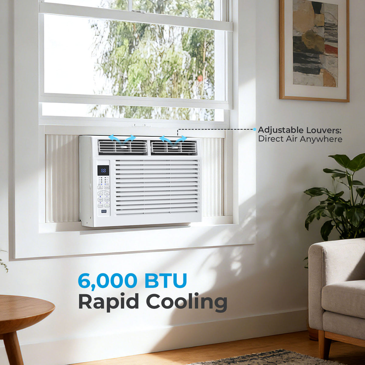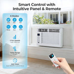 Fast & Powerful Cooling: The ac window unit is perfect for cooling a compact room. This 6,000 BTU window air conditioner efficiently cools areas up to 250 square feet, making it perfect for bedrooms, living rooms, and home offices. Come with 6 modes settings, 4 fan speeds to give you the perfect amount of cooling every time.Controller type:Button Control.Air Flow efficiency:153 CFM.