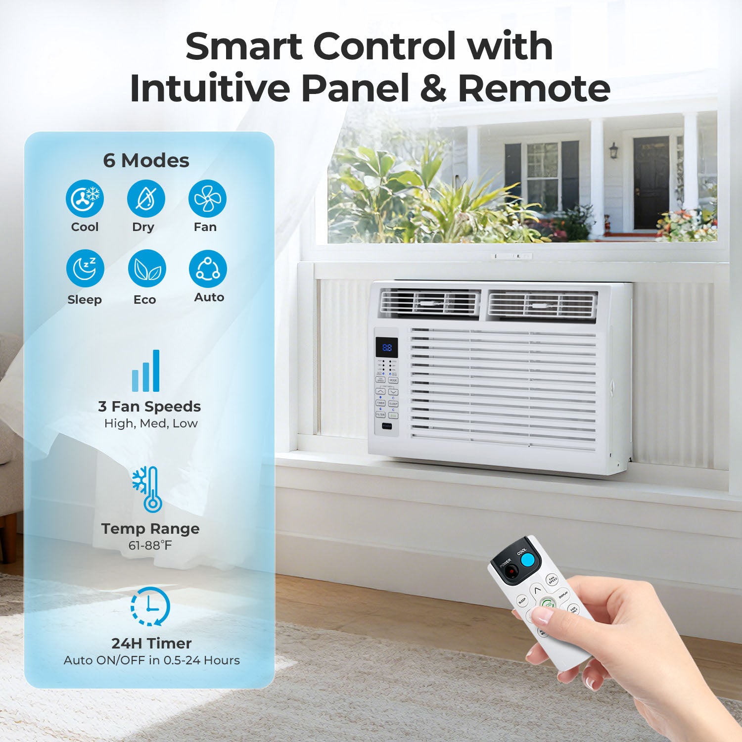 Easy Operation: Operating this air conditioners for windows is an easy-understanding and enjoyable cooling experience ( 61℉ - 88℉). We can set all functions on LED digital display or remote control ( Sleep Mode, Fan Speed Selection, 24 Hour Timer, ECO Mode, Auto Mode, and Fan Mode ).