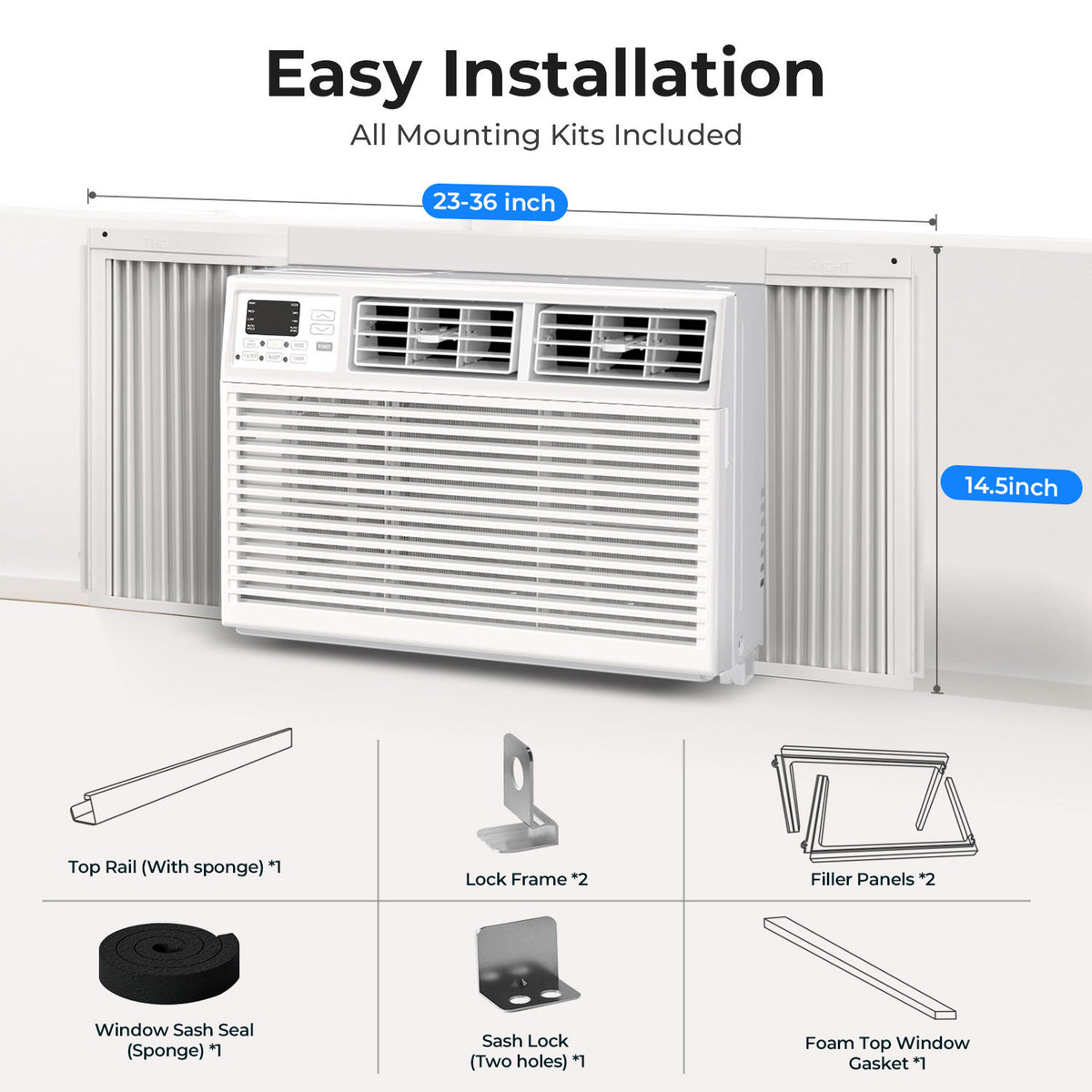- Convenient & Hassle-Free Setup: This window air conditioner features an easy-to-read LED display and panel controls, along with a remote for effortless operation from across the room. Comes with all necessary accessories, a detailed user manual, and is designed for simple installation. It fits windows with a width of 23 - 36 inches and a minimum height of 14.5 inches.