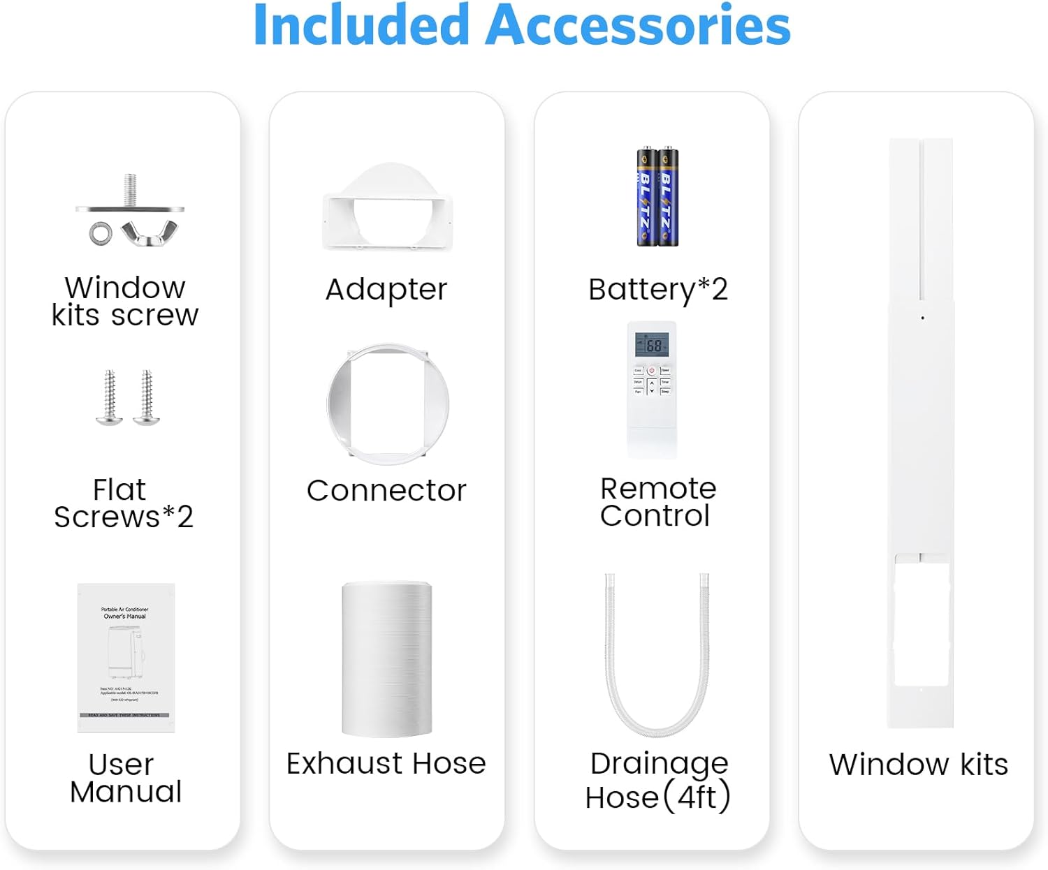 - 【Easy Installation】Roll your air conditioner to the preferred cooling area, attach the 5ft hose and adjustable window brackets (fits openings from 26-50“), turn the unit on and let your cooling begin. An exhaust hose and window kit are included, no extra tools are needed for assembly. Installation instructions are simple and can be done by anyone.
