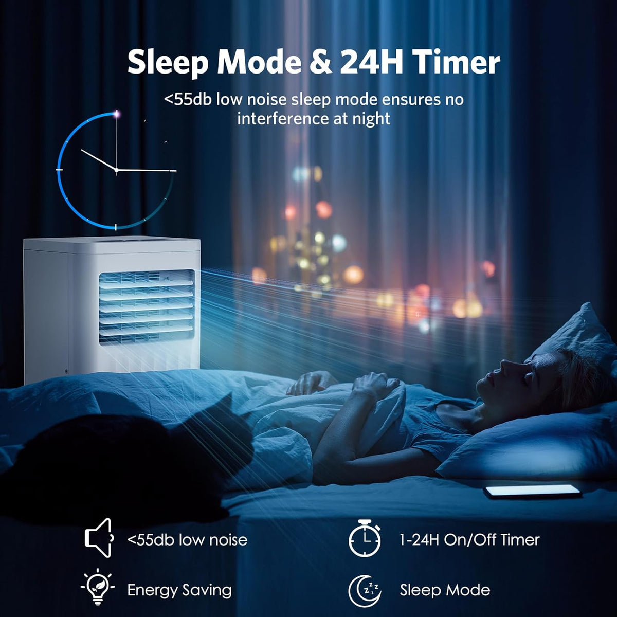 - 【4-In-1 Comfort&24 Hours Timer】The portable ac units for rooms has cooling/dehumidification/fan/sleep/24-hour timer settings all in one. Not only an air cooler, it can also be used as a dehumidifier or fan. The air conditioner has strong wind mode and normal mode, which can provide you with fast and effective cooling effect in minutes. With a powerful 63 pints/day dehumidification capacity, this portable air conditioner helps keep your space fresh and dry, even in the most humid and hot areas.