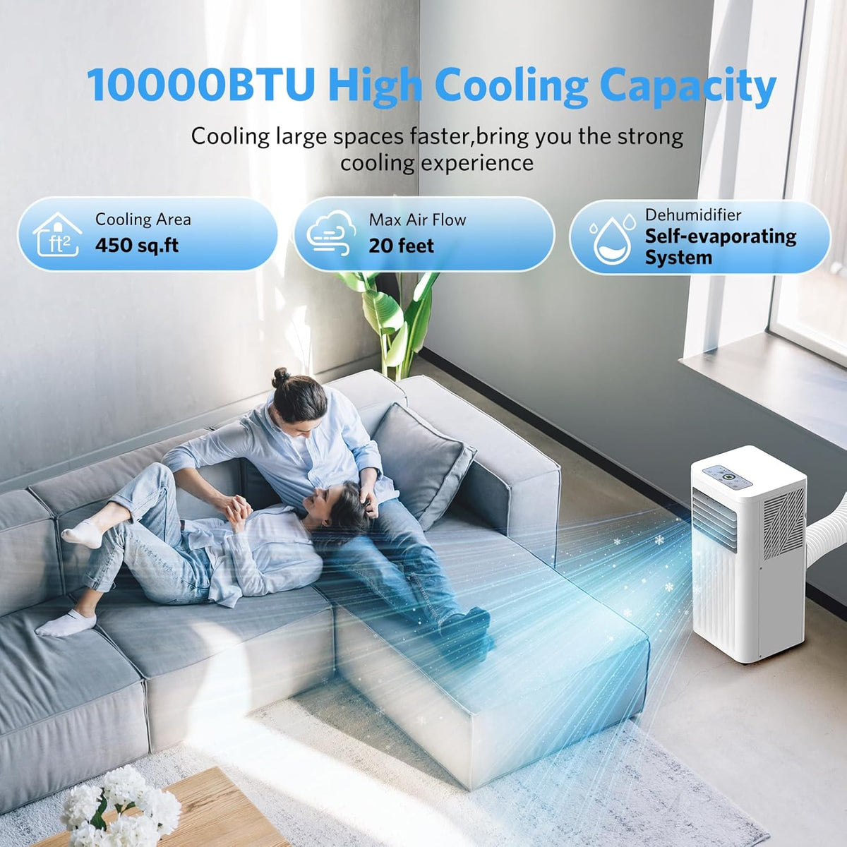 - 【Cooling in Minutes, Perfect for Large Rooms】Electactic 10000BTU air conditioner portable's 120°wide-angle cold air range and 15 feet of cold air flow can quickly circulate air in minutes and instantly cool your room, perfect for large rooms and cooling multiple rooms at the same time. In addition, the air conditioner's self-evaporative system uses the water collected by dehumidification to cool the condenser, improving cooling efficiency and keeping you cool on hot summer days.