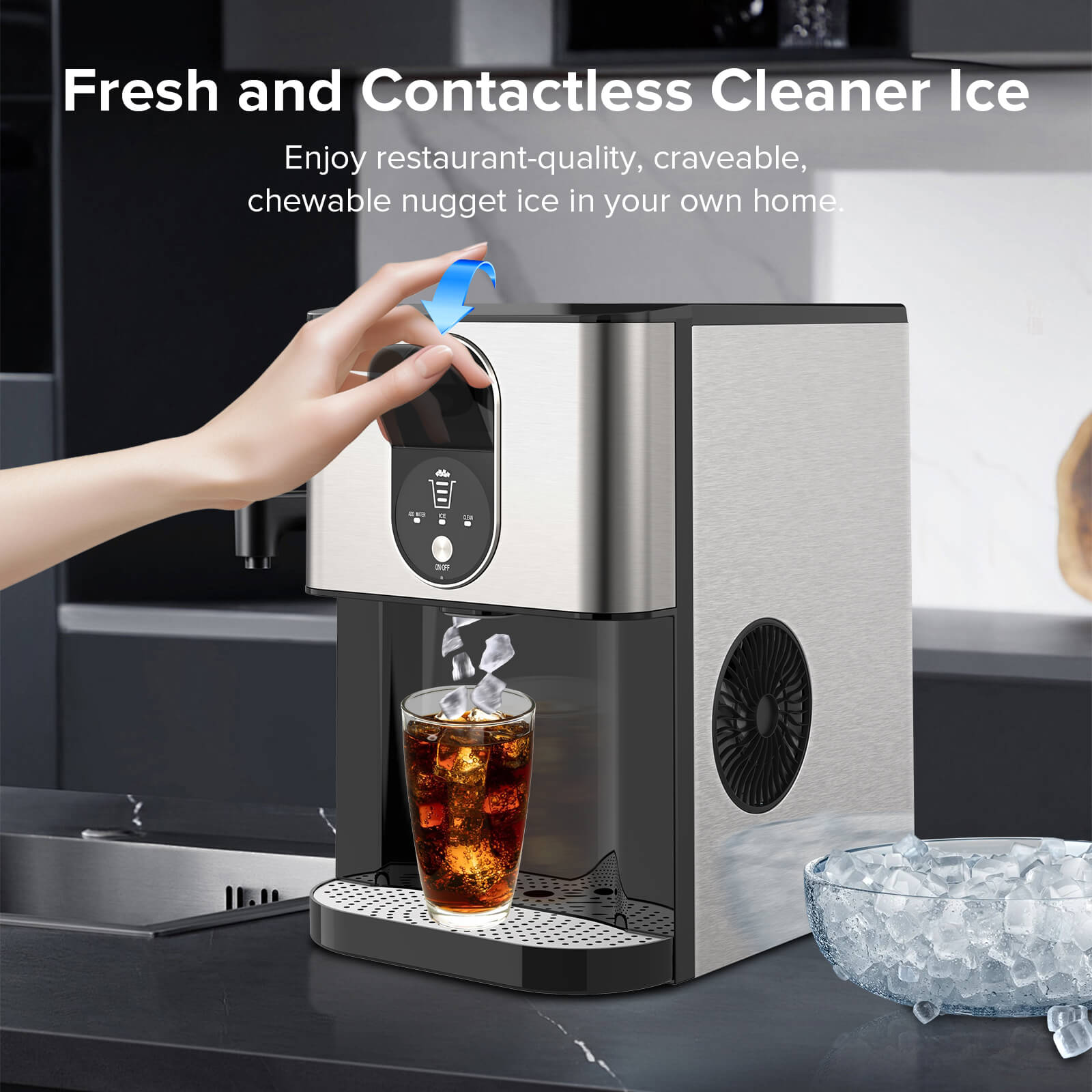 - FREE YOUR HANDS: Unlike regular ice makers, you need to open the lid and scoop up the ice with an ice scoop. This ice maker only needs you to pull the switch, and the nugget ice will come out automatically. Freeing your hands. The ice cubes will not be exposed to the air, making it cleaner and healthier.