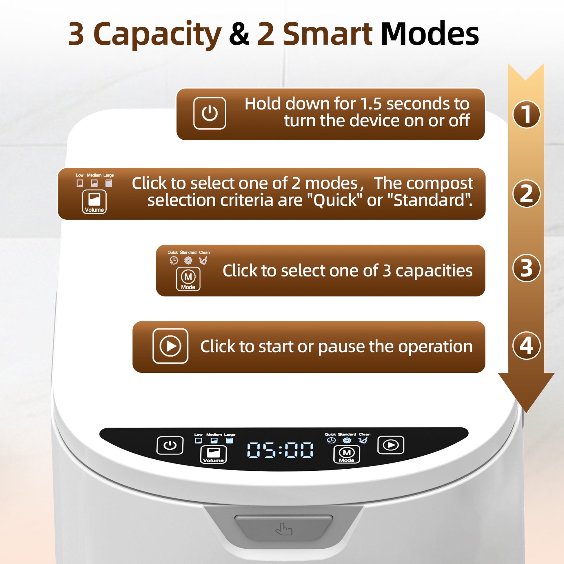 - 🔄 Smart & Simple 2-Mode OperationWhether you need quick results or thorough processing, our smart trash can composter has you covered. Choose between Quick Mode for speed and Standard Mode for maximum efficiency. The intuitive one-touch control makes this one of the most accessible kitchen gadgets, perfect for everyone.