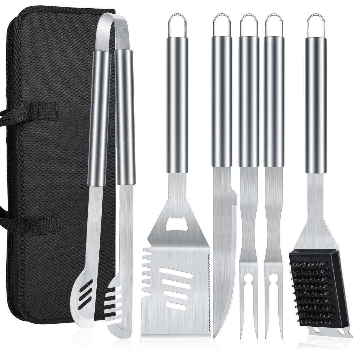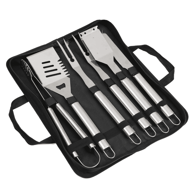 Take your grilling to the next level with this premium stainless steel set, featuring a spatula, tongs, cleaning brush, long-handle carving fork (x2), and a long-handle BBQ knife. Durable, rust-resistant, and easy to clean, this set comes neatly packed in a stylish carrying bag—perfect for backyard BBQs, camping trips, and picnics. A must-have gift for every grill master!