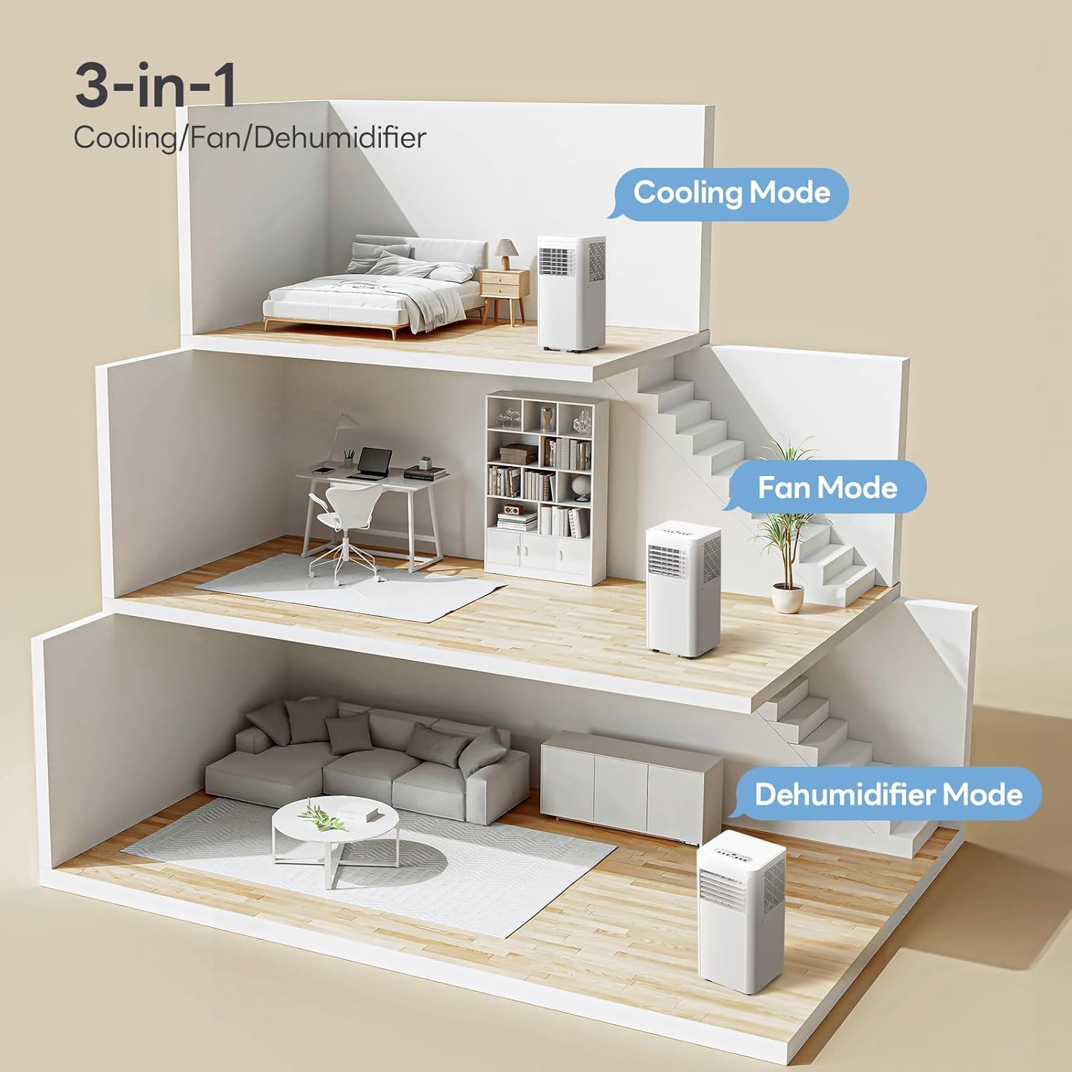 - 3-in-1 Mode: This air conditioner features three modes: cooling, dehumidifying, and fan mode. Suitable for year-round use, it effortlessly meets your diverse needs across various scenarios